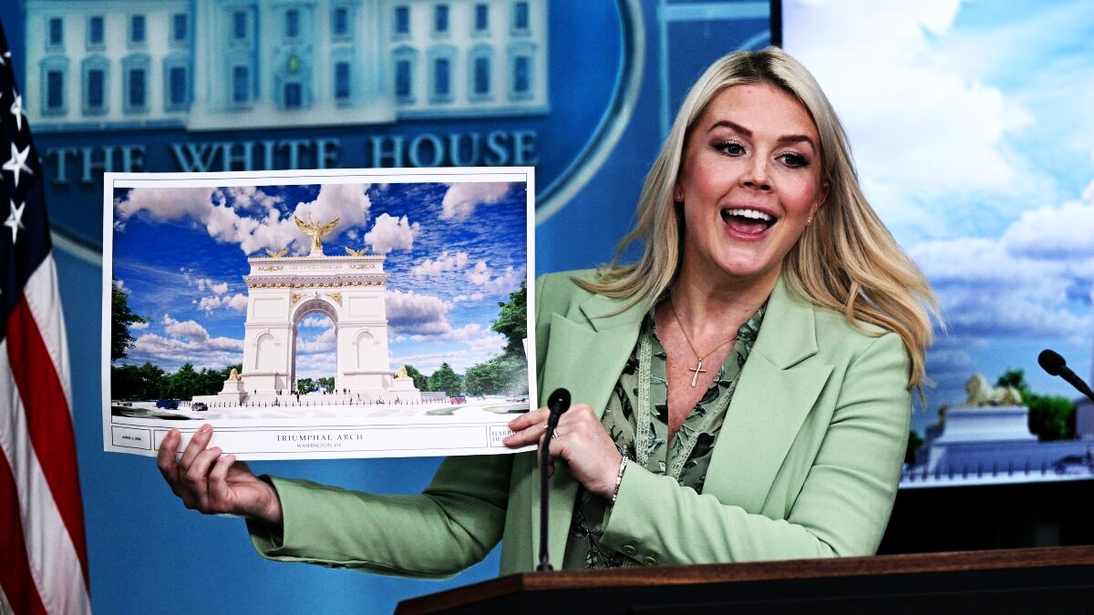 It is quite easy to realize on whom Grönköping’s Weekly poured its customary irony and I thought the last statement was just a made-up allusion to Trump's bombastic redecoration of the White House with gold, marble and a huge ballroom. Imagine my surprise when I saw on TV on Wednesday (April 14th) how the US President's press secretary Karoline Leavitt showed a placard with the triumphal arch that this incomprehensibly narcissistic fool plans to erect in Washington.