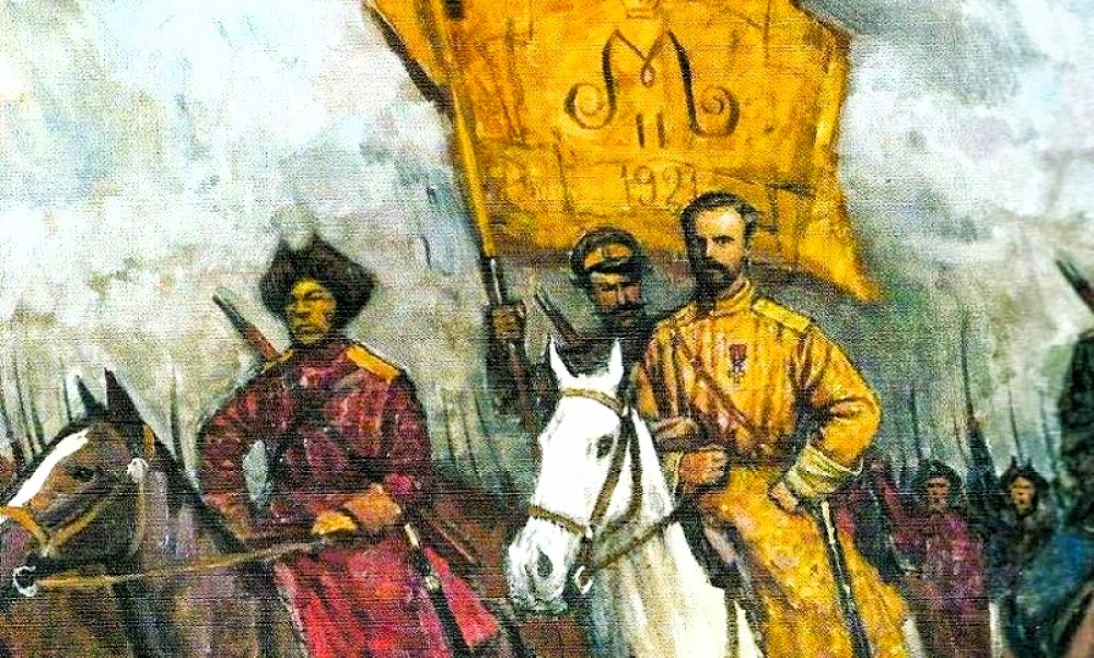 As a banner, Ungern-Sternberg carried a yellow streamer, the colour of Buddhism, with the text "M II 1921", which stood for Archduke Mikel Alexandrovich of Russia. He was the younger brother of Tsar Nicholas II, whom he had appointed as his successor at the time of his abdication.