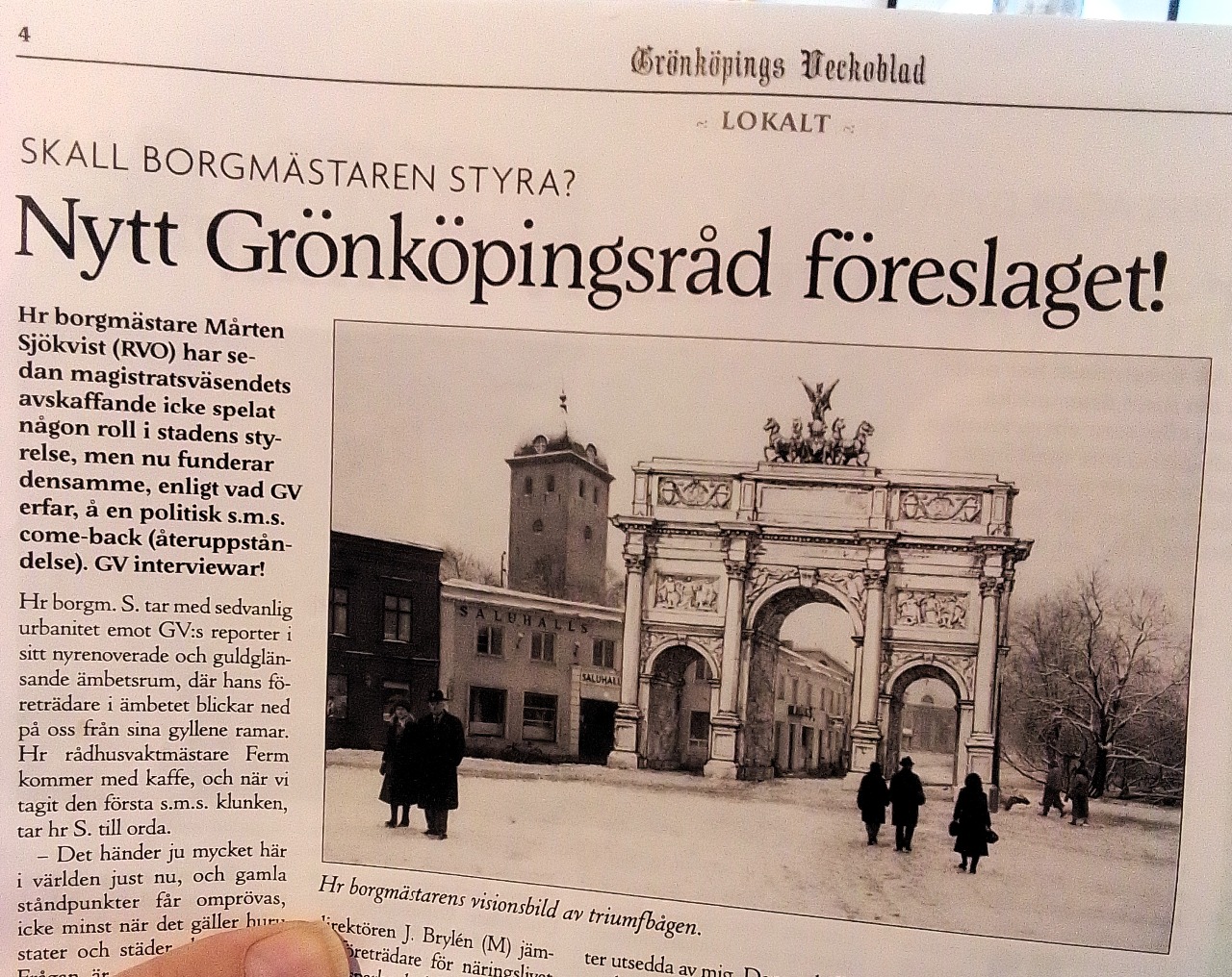 In addition to those "deserving citizens" he intends to appoint to the council Mr. Mayor Sjökvist wants to make room on the board for some "cultivated people", such as his "future son-in-law" the poet A. Vesterlund and his daughter Doris Sjökvist. Mr. Mayor Sjökvist concluded the interview by stressing how important it is to keep up with changing times, something we see "not least on the other side of the Atlantic". With that said, Mr. Mayor Sjökvist returned to sketching the triumphal arch he hopes will be erected on the Town Hall Square.