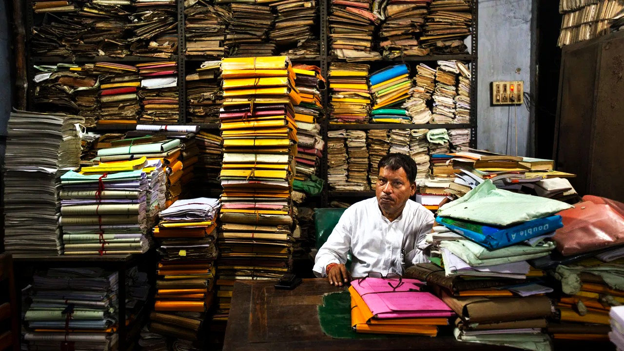 Dagboksskrivaren finner att det bästa sättet är att röra sig mellan kontor och olika destinationer är att slinka in där dörrar står öppna och där man inte ställer honom några frågor. På så sätt kommer han exempelvis till ”biblioteket”, begravt djupt ner i kontorslabyrinten – ett rum belamrat med dammiga, gråaktiga volymer, tätt uppställda på bågnande hyllor. En skallig vindögd gubbe med släpande gång visar honom under takets fåtaliga, nakna glödlampor den ena illaluktande volymen efter den andra, alltmedan han mumlar ”ett strålande verk … strålande.” Då den unge agenten stapplar ut från denna ”paranoida mardröm”, känner han det som om han lämnat ett slakthus.