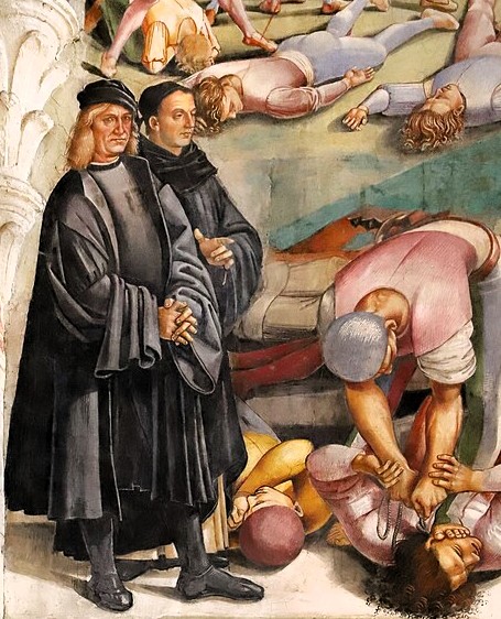 Denne diskrete munk var inte enbart varit en av sin tids störste målare, något som inte vill säga lite varit eftersom tiden varit en av världskonstens höjdpunkter – Fra Angelico framstår även för vår tid som en odödlig mästare. Vi ser honom på kollegan Luca Signorellis fresk i Orvieto där de två betraktar allt det våld som utlösts av Antikrist, en världspotentat som under falska förespeglingar skulle sätta världen i brand. Vi känner honom som Hitler eller Stalin, eller varför inte Putin, Trump och Netanyahu. Där står de två konstnärerna bredvid en man som sätter foten på en medmänniskas huvud, medan han stryper honom till död. Den äldre Signorelli, har en trött min, den mildare och till synes yngre munken (han hade dock dött fyrtiofem är tidigare) blickar tämligen uttryckslöst ut över den fruktansvärda massaker som äger rum runtomkring honom, med en diskret gest tycks det dock som om han vill göra oss uppmärksamma på det otyglade väldet som rasar i hans närhet.