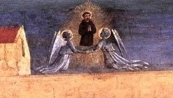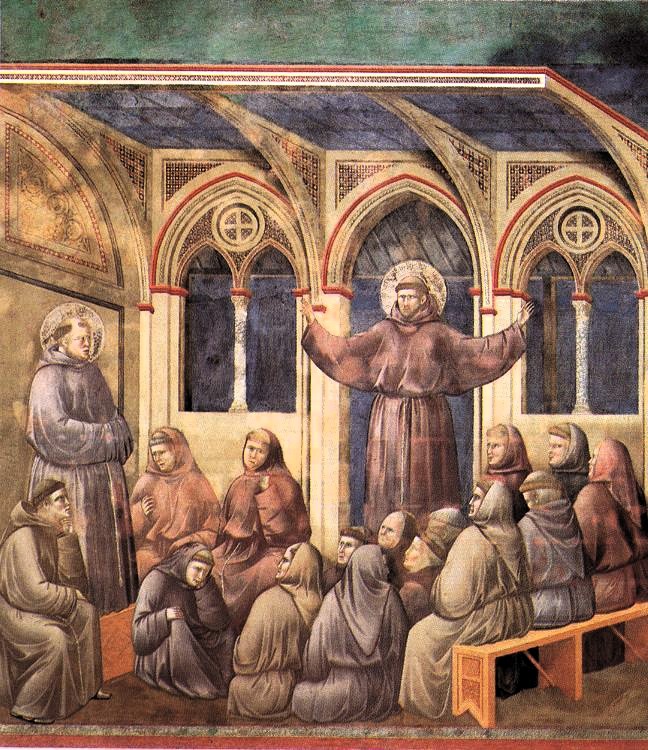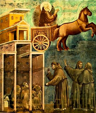 Och visst var Fra Angelico unik och på många sätt före sin tid. Jag tänker på en liten tavla jag sett i Berlin, L'Apparizione di san Francesco su un carro di fuoco, Den helige Fransiskus uppenbarelse på en vagn av eld. Målningen grundar sig på en av de många legender som växte fram efter Fransiskus död och som samlades av hans lärjungar. Enligt denna berättelse uppenbarade sig den nyligen avlidne Helige Fransiskus medan hans ordensbroder Antonius av Padua predikade för en samling munkar i det franska Arles. Giotto har i överkyrkan i Assis 1295 skildrat hur Antonius plötsligt tystnar medan han står framför de andäktigt lyssnande munkarna. Endast han, och en annan munk vid hans sida, kan se uppenbarelsen i salens ingång.