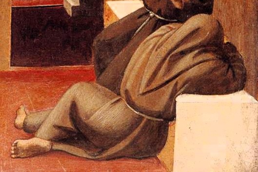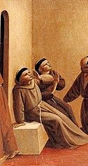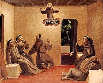 Nu till Fra Angelicos version av samma händelse, kanske målad 140 år senare. Dess realism är förbluffande. På den lilla målningen ser vi fem munkar i ett kalt rum, som öppnar sig mot en månbelyst trädgård. En av dem har somnat medan de andra tycks vara yrvakna. En av dem sitter uträckt på sin hårda stenbänk, som om han under sömnen har sjunkit ned. Han stödjer med ena handen medan han med den andra tar sig förvånat för ansiktet. En av munkarna har fallit ner på knä och blickar upp mot en ljusbemängd vision av den Helige Fransiskus, som inte färdas i någon eldvagn utan i diminutiv gestalt uppenbarat sig buren av ett moln på vilket det står ”Frid vare med eder”. Här rör det sig utan tvekan om en vision. Men se med vilken förbluffande skicklighet Fra Angelico skildrat det hela! Hur oväntat modernt det hela ter sig, hur originell är inte den lilla scenen?