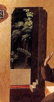 Till vänster har en munk nyss lämnat rummet, ovetande om uppenbarelsen. Det skulle dröja hundratals år innan konstnärerna vågade beskära en bildytans personer på ett sådant sätt. Det blev vanligt först med fotgrafikonstens uppfinnande och vi möter det ofta hos en impressionister som Degas.