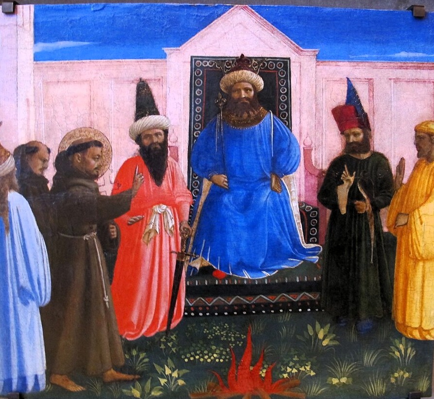 Fra Angelicos bild framställer en legendarisk historia som förtäljer hur Fransiskus erbjöd sig att gå genom eld för att bevisa sin förtröstan på Gud, under förutsättningen att de muslimska imamerna antog utmaningen och gjorde sammaledes. Då de tvekade avstod Fransiskus från eldvandringen.