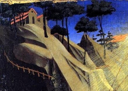 Imponerande är pinjerna som omger klosterkyrkan, framställd underifrån i ett djärvt perspektiv. Målningen finns nu i Vatikanmuséet.
