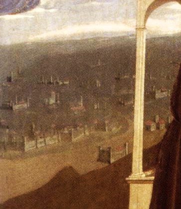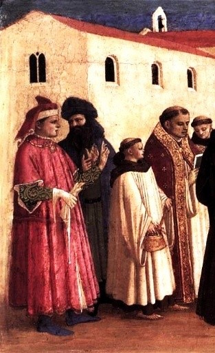 Nåväl, i Fra Angelicos tavla tycks det alltså som om de träffas utanför Rom och i himlen ser vi hur Jungfru Maria knäfaller inför Kristus och ber honom hjälpa de två helgonen att frälsa världen från sina synder och hejda kättarnas anstormning. Framställningen präglas av den frid vi finner i så många andra av Fra Angelicos målningar. Intressant är hans framställning av den avlägsna storstaden, omvälvd av ett grått töcken.