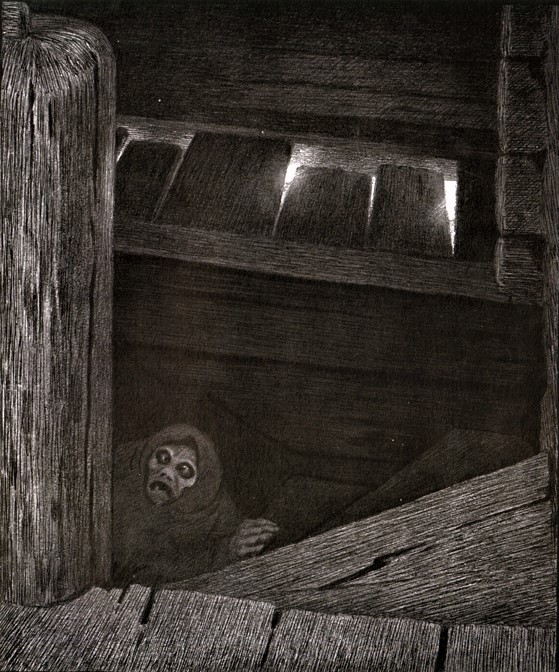 Märkligt var även att väggarna inne i de det där otäta, ovanligt stora uthuset var täckta av tapeter, som flagnat i stora sjok och remsor. Under dem, vilket varit vanligt förr i tiden hade man täckt väggarna, inte med uppklistrat tidningspapper som man gjorde då, men med etsningar av vilka jag kände igen de flesta gjorda som de var av Goya, Klinger, Esher, m.fl.