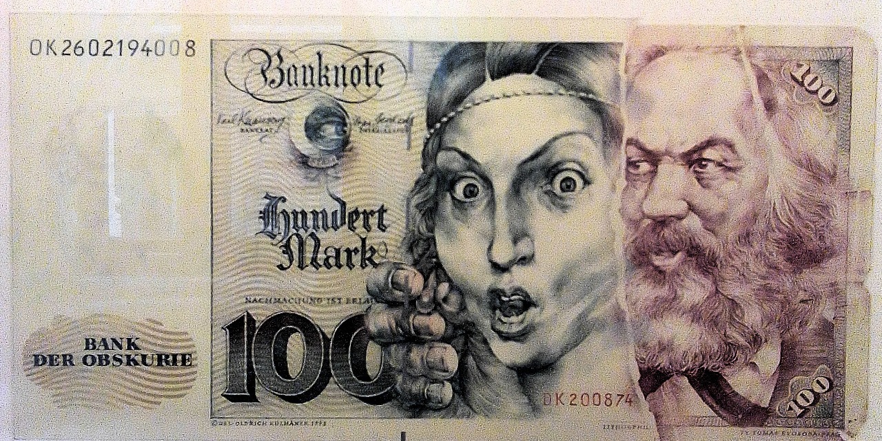 Kulhánek ägnade sig också åt att som grafisk konstnär framställa en mängd parodier på olika sedlar. Nedan har han exempelvis manipulerat en tysk hundramark sedel med en bild på Clara Schumann, gift med den geniale kompositören men sedermera obotlig galne Robert Schumann och själv en skicklig pianist och kompositör. För övrigt tycker jag att det rör sig om en ovanligt vacker sedel.
