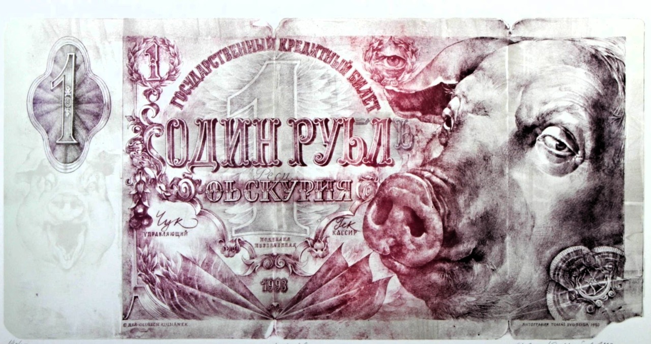 Möjligen i protest mot den rysk-sovjetiska ockupationen av Tjeckoslovakien 1968 gjorde Kulhánek några år senare en rubelsedel som framställde en fet gris.