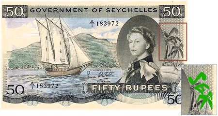 Även riktiga sedlar har någon gång visat sig innehålla dolda satiriska, eller skämtsamma, anspelningar. Berömd är sedlar från den lilla ögruppen Seychellerna, belägen långt ute i Indiska Oceanen, tryckta år 1968. Man hade snart upptäckt att palmkronornas mönster på en av dem kunde utläsas som ”sex”, medan korallernas mönster på en annan sedel kunde läsas som scum, avskum.