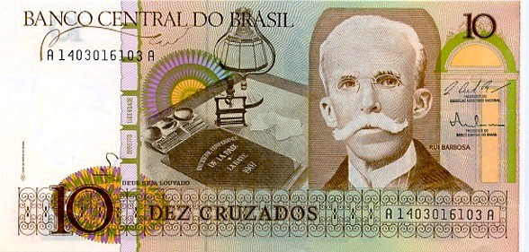 Jag har också en sedel från Brasilien som visade sig vara skapad av Czesław Słania och i vanlig ordning tog jag reda på vem Ruy Barbosa de Oliveira (1849 – 1923) kunde vara. Det visade sig att han varit en liberalt sinnad författare, politiker och reformator. Barbosa hade varit inflytelserik då det gällt att avskaffa det brasilianska slaveriet, något som inte skedde förrän 1888. Då den så kallade Gyllene lagen trätt i kraft såg han till att all dokumentation kring slaveriet och dess brasilianska historia effektivt förstördes under pretexten att Barbosa ville utplåna denna skamfläck ur Brasiliens historia. I själva verket tycks det som om han ville skydda tidigare, brutala slavägare från följderna av deras beteende.