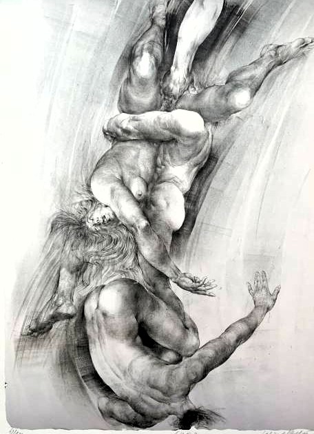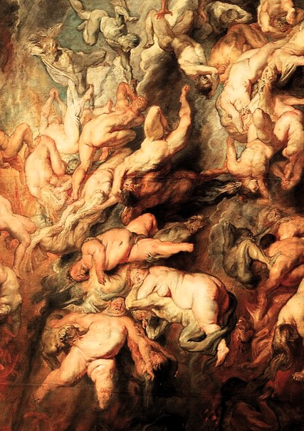 En annan serie med fallande nakna människokroppar förde tankarna till Rubens visioner av kringslingrande, nedstörtande människomassor under den Yttersta domen och de dömdas fall ner i Helvetet.