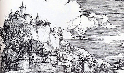 I såväl sina målnigar som i sina grafiska tryck ger oss Dürer allt som oftast ideras bakgrunder intryck från städer och byar som han sett och skissat ner under sina talrika resor.