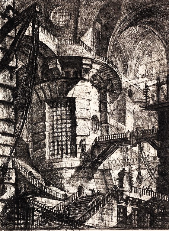 Just mardrömslika scener tycks ha varit ett uppskattat tema hos gravörer. Här finner vi Piranesis labyrintiskt skräckfyllt tunga fängelseinteriörer, som likt i flera av Borges noveller tycks omfatta hela världen.
