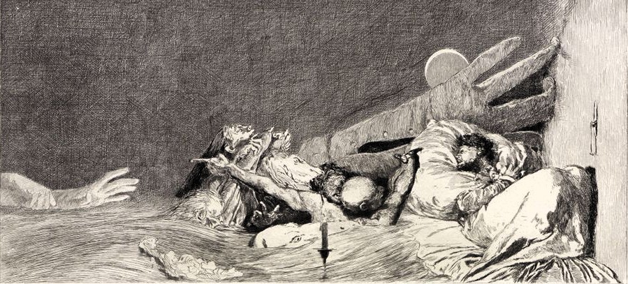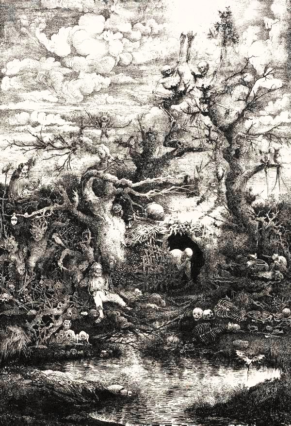 Då jag nu läser igenom vad jag skrivit om mina nedslag i grafikens historia finner jag att de fått en inriktning åt det lugubra hållet. Goya, Kubin, Klinger, Redon, Doré och flera andra med dem tycks ha haft en fallehet för tillvarons och fantasins mörkare sidor.