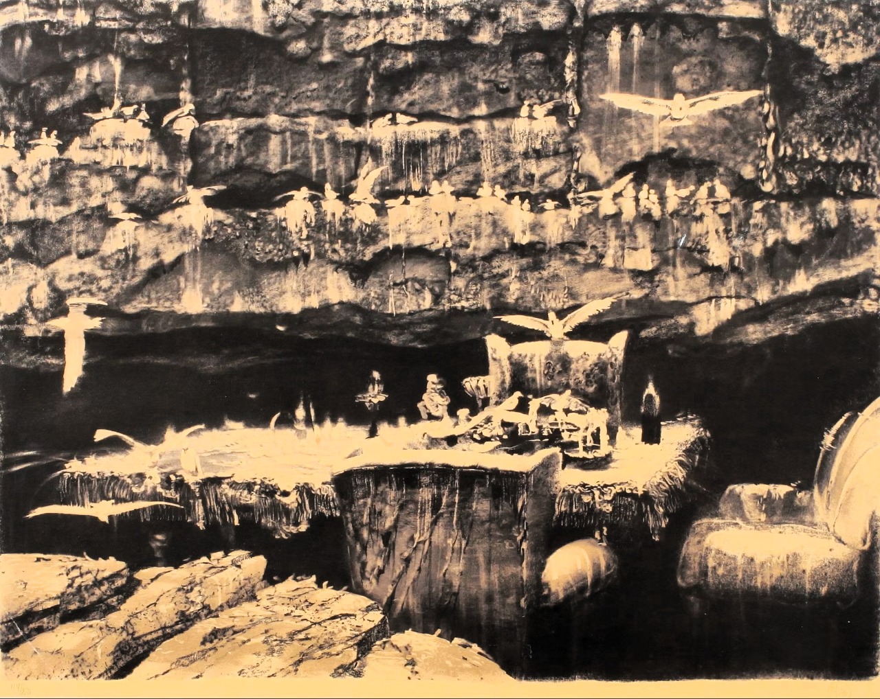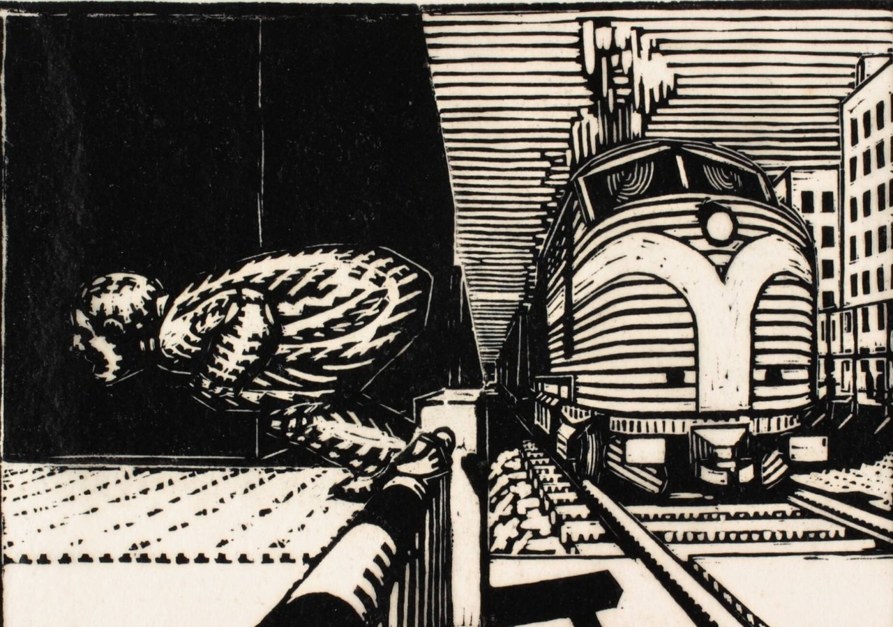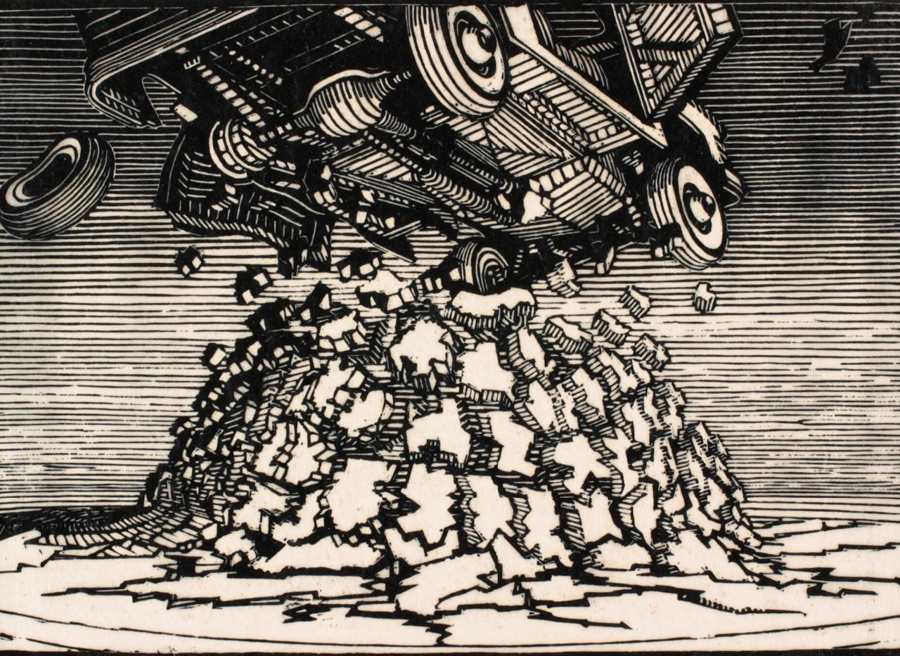 I svensken Roy Fribergs (1934 – 2016) grafiska konst tycks det som om katastrofen redan ägt rum, förstenade människor och deras bostäder tycks ha blivit förenade med ett postapokalyptiskt klipplandskap.