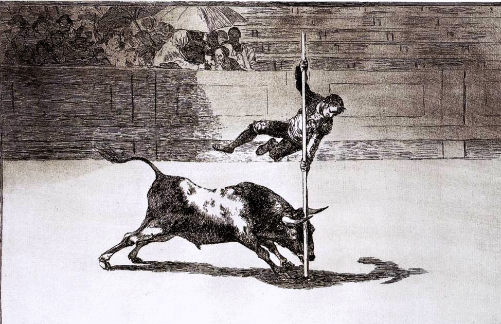 Betrakta hur Goya disponerat ett av sina grafiska blad. Tyngdpunkten ligger vid dess vänstra sida, som ligger i skugga och där publiken samlats. Detta skapar en illusion av tjurens våldsamma framfart genom dess rörelse in i arenans tomrum, men i bildens mitt hejdas dess raseri av den akrobatiske matadorens vertikala käpp med vilken han för ett ögonblick hejdar all rörelse och blir liksom stillastående svävande mitt i luften och får betraktaren att undra: ”Hur skall det gå?” Som i ett fotografi har Goya stoppat tiden.