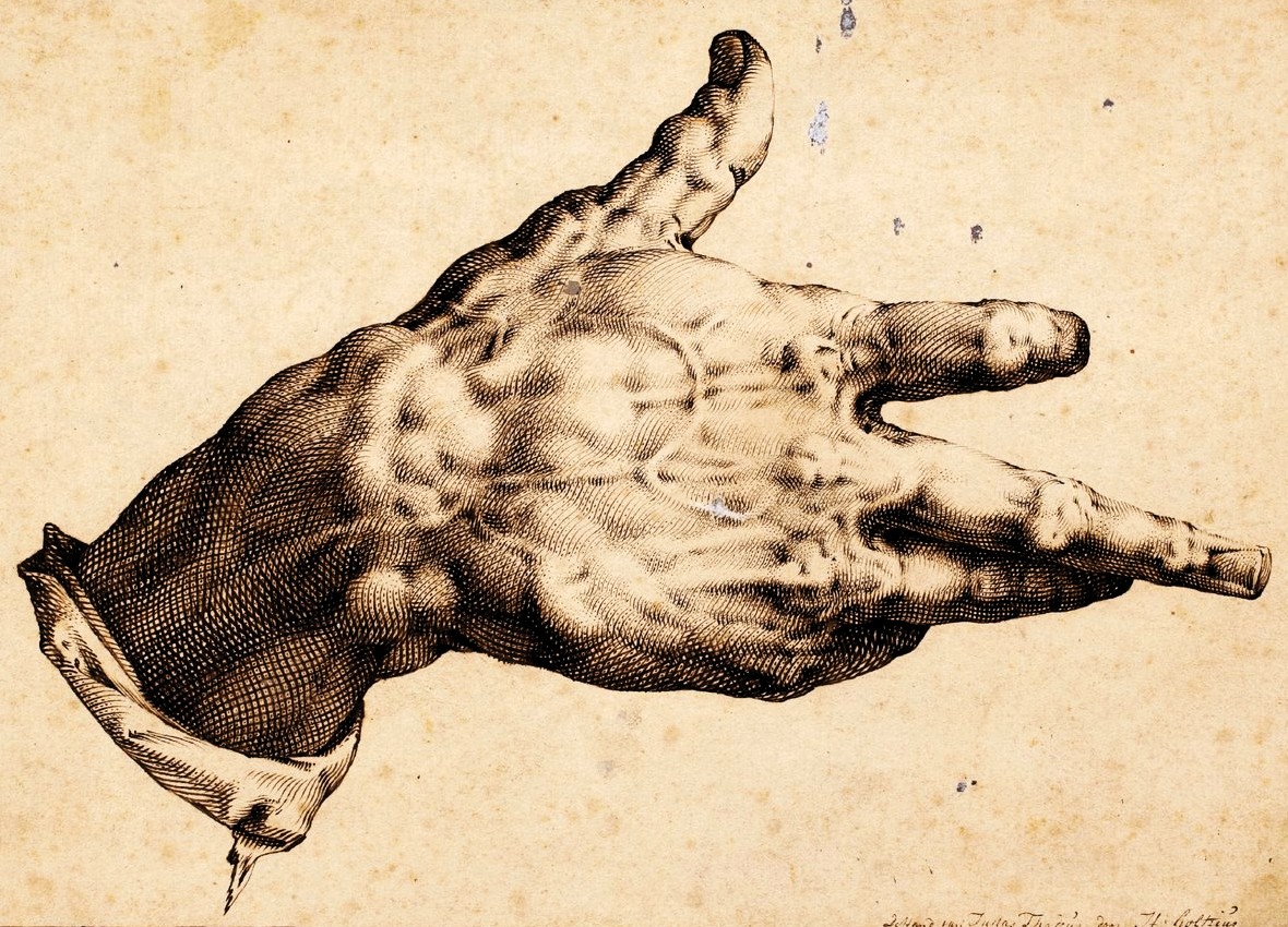 Men, det fråntar inte alls Goltzius hans mästerskap. Goltzius hade en missbildad högerhand efter att då han var liten ha skadat den över en eldslåga Det visade sig dock att hans skadade hand var särskilt väl lämpad för att hålla i burinen, etsningsnålen. Han tvingades lägga stor kraft i sina arm- och axelmuskler och ihärdig träning gav honom en kraftfull ”schwung” i sin linjeföring, kanske även en orsak till den omsorg han ständigt visade då det gällde att framhäva muskulaturen hos sina getslater. Vid flera tillfällen avbildad Goltzius sin högerhand, som här nedan i en bild han kallade för Judas hand.