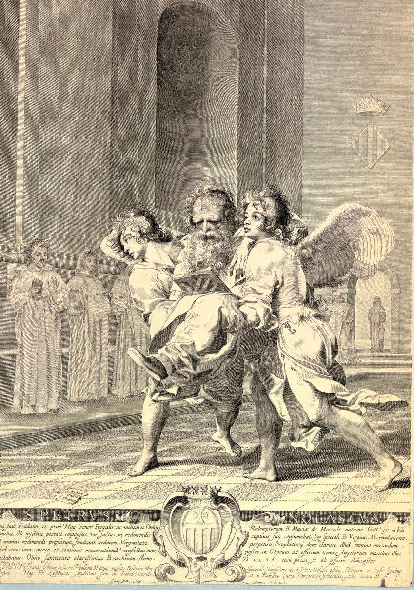 Ett åldrigt helgon bärs sittande och läsande fram av två änglar som i sin ansträngning inte tycks vara i besittning av några himmelska krafter. Detta medan de betraktas av en rad munkar andäktigt stående ett luftigt kyrkorum. Jag har inte en aning om varför Skt. Petrus bärs fram till altaret, medan han är försjunken i läsningen av sin bok, inte heller vem helgonet var, annat än att han samlade in pengar för att friköpa kristna slavar från det muslimska Maghreb.