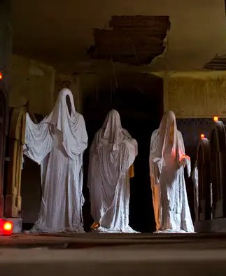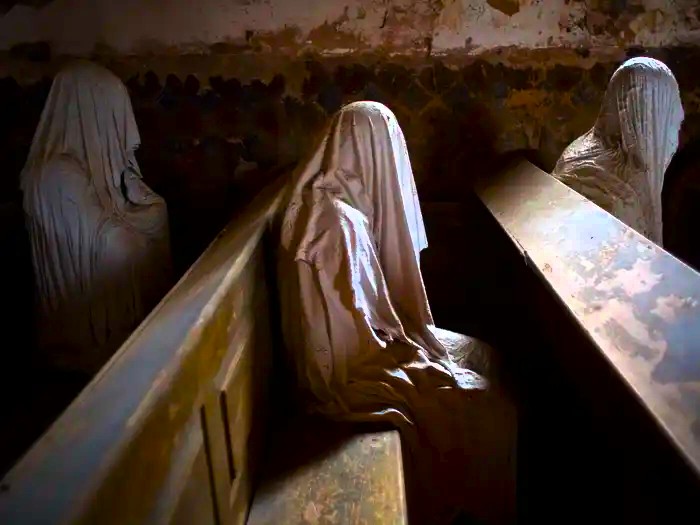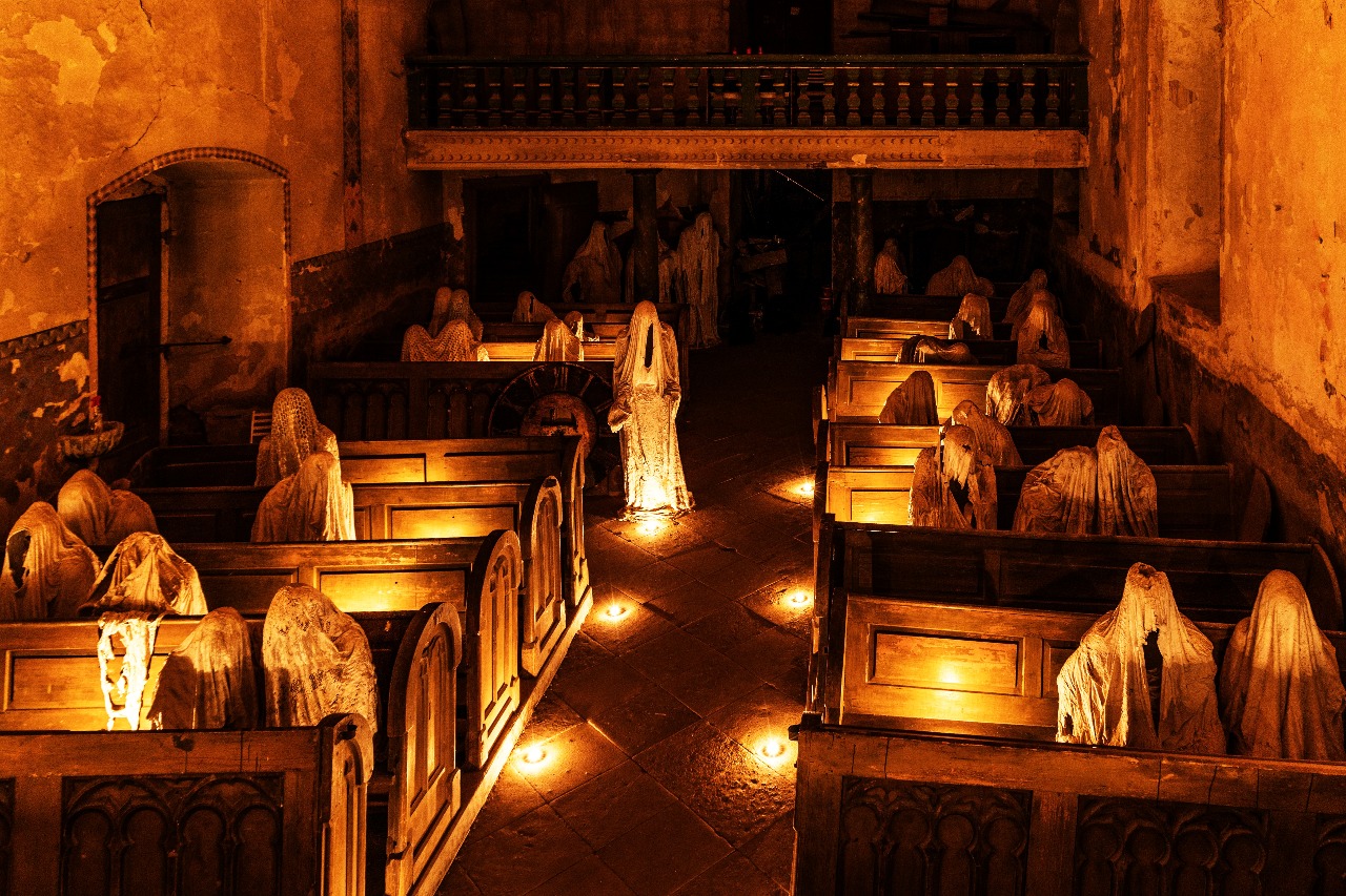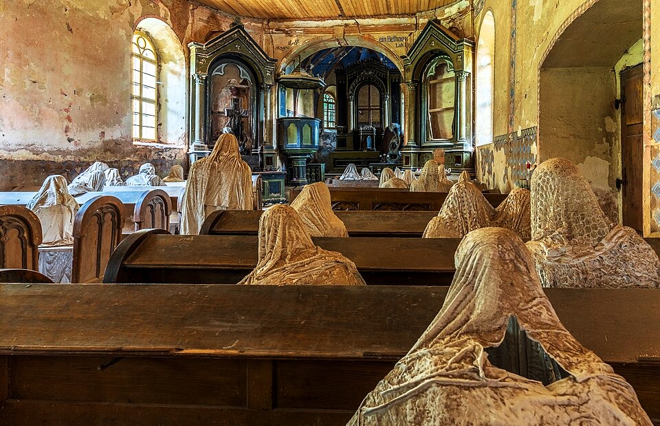 I den förfallna kyrkan tyckte sig Hadrava förnimma närvaron av alla dessa försvunna människors vålnader och beslöt sig för att befolka kyrkorummet med 32 gipsgestalter i naturlig storlek. Eftersom de representerade numera förgätna människor fick de formen av spökgestalter.